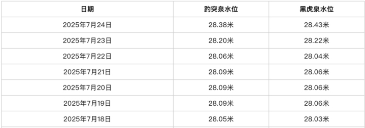 受近期连续多日降雨的影响,济南地下水位得到有效涵养和补给,让泉水喝了个“饱”。根据济南市城乡水务局官网发布的数据,7月24日7时,趵突泉地下水位为28.38米,较前一日上涨18厘米;黑虎泉地下水位上涨势头更猛,回升至28.43米,较前一日上涨21厘米。