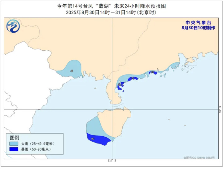 降水预报:8月30日14时至31日14时,广东南部沿海、广西南部、海南岛西部和南部等地的部分地区有大到暴雨(50至90毫米)。