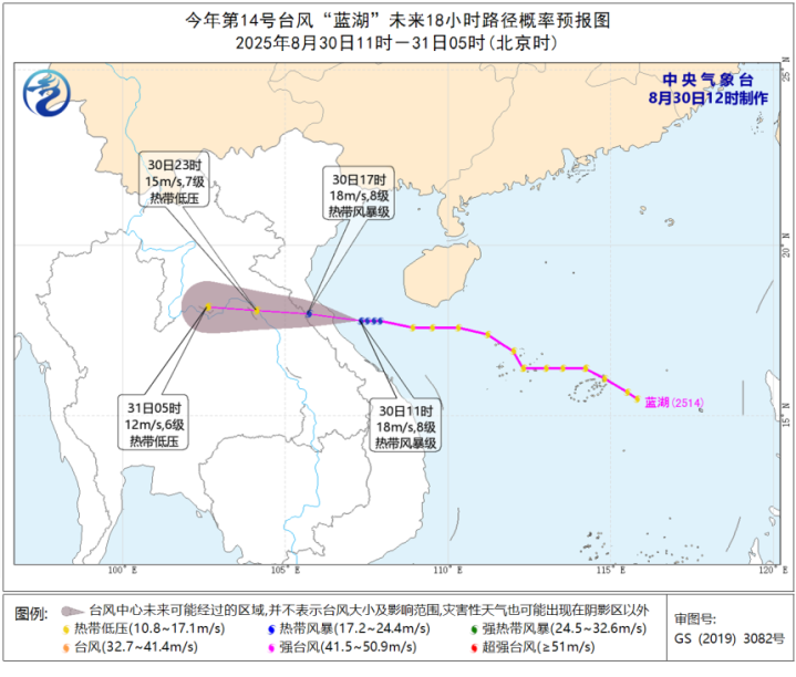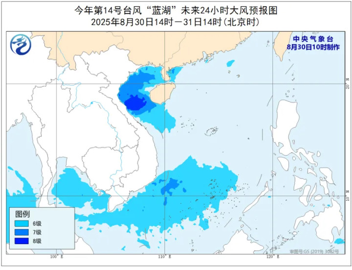 大风预报:8月30日14时至31日14时,南海西部和南部的部分海域、北部湾、琼州海峡、广东西部沿海、广西沿海、海南岛沿海有6至7级大风,其中南海西部的部分海域、北部湾南部海域风力有8级,阵风9至11级。