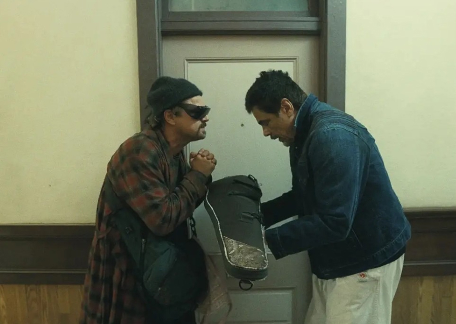 让超级巨星肤浅地扮演笨笨的小人物,甚至在逃命时候夸张地从屋顶上摔了下去,这不仅是反差的谐谑闹剧,逃亡主题的公路喜剧把原本不会有交集的、割裂的小世界串联起来——有渴望革命却不爱具体的人们的理想主义者,有操控他人命运的老白男既得利益群体,有既是教练又是“教父”的大家长力所能及地庇护弱者,形形色色的隐秘社团组成关于这个时代的光怪陆离的拼图。这是一个复杂且含混的世界,但藏在摄影机后面的说书人的口吻是轻盈洒脱的,就像墨西哥少年踩着滑板一脚蹬出一个街区。摄影机的镜头何其自由地穿梭在看起来是平行宇宙的不同人间,深入群众的激进革命分子藏在贫民窟的深处,西班牙裔的跆拳道教练在杂货店的地下给墨西哥移民们创造了亲密的收容所,掌握权力和金钱的老白男们聚会时同样像不能见光的鼹鼠躲在最深的地库,人间运转的真相是花样百出的“秘密”。